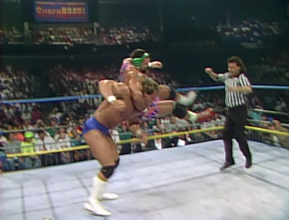 On the ramp, Tony Schiavone and Missy Hyatt interview the Z-Man. Due to a torn bicep, Z-Man has missed six weeks of action. According to a hotline poll, Hyatt will return to the wrestlers’ dressing room for an interview. We then revisit Hyatt’s first attempt back at WrestleWar ’91. As Hyatt throws a tantrum, Schiavone states that “all the fans are behind Missy Hyatt.” I hope they got inoculated afterward.